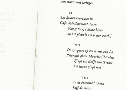 Charmant gedicht geschreven in en over Ménilmontant in Parijs. Geheel met de hand gezet uit de Baskerville en een fantastische biljetletter en gedrukt op een antieke handdegel en proefpers uit de negentiende eeuw.