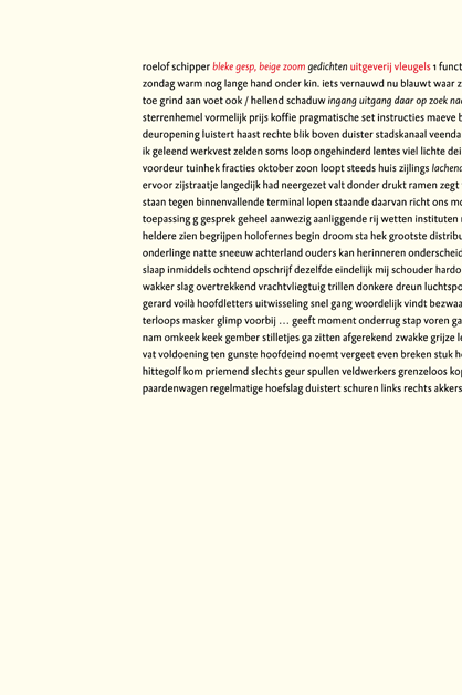 Sasja Janssen: ‘Het debuut bleke gesp, beige zoom van Roelof Schipper is een gebeurtenis. Zijn gedichten vragen om herlezing, het liefst hardop, zodat zijn taal in je gaat rondzingen. Bijna als vanzelf verbind je je met het lyrisch ik, zijn manier van waarnemen, en het aftasten van zijn schrijven. De regels met hun aparte interpunctie zijn doordrenkt van het zintuiglijke en het abstracte. Zo word je een wereld in getrokken waar je steeds opnieuw een veranderd zicht krijgt op de mens en zijn zijn. Dit werk is met geen andere poëzie te vergelijken, hooguit met die van Faverey.’